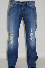 Light blue denim wash Worn look, created by strong fading and areas of frayed destroyed denim Frayed denim down both legs on the front Button Fly Slim fitting style with a straight leg finish Made...